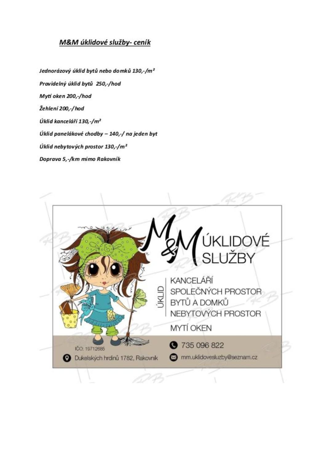 Společnost M&M úklidové služby se zabývá komplexním úklidem domácností, kanceláří, společných či nebytových prostor. Věnujeme se důkladnému čištění každé místnosti v domě nebo bytě. Vysáváme podlahy, myjeme okna, otíráme prach, myjeme spotřebiče a povrchy, čistíme koupelny a toalety a podobně. V případě potřeby pomáháme s vyhazováním nepotřebných věcí a vyměňujeme ložní prádlo.